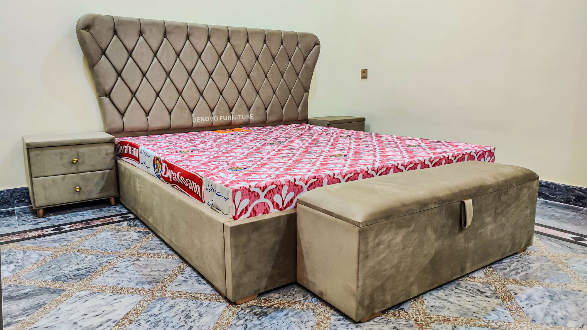 Bed set + ottoman box Includes: Bed + 2 side tables + dressing table with mirror + ottoman Box